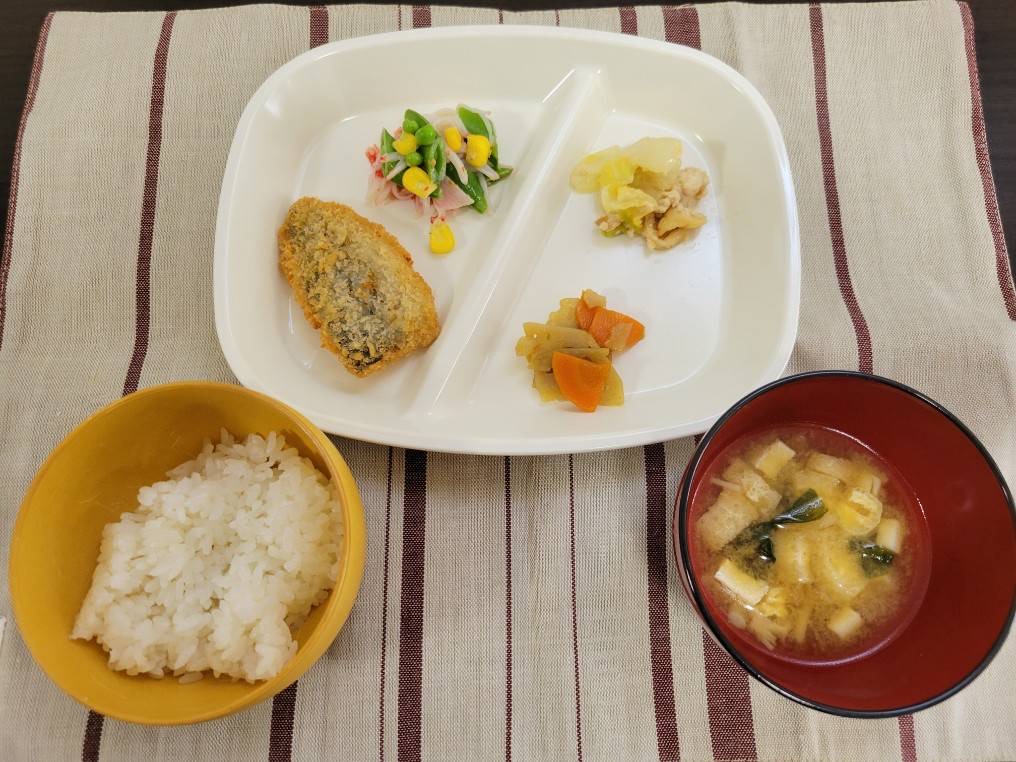 ご飯、味噌汁、アジフライ、蓮根と人参のきんぴら、白菜と鶏ひき肉のうま煮、スナップエンドウとカニカマサラダ/セレクト・スティックゼリー