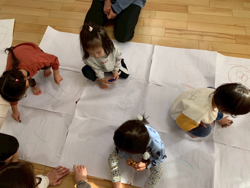 今日は不審者の避難訓練をしたよ!!知らない人が玄関やお庭に来てびっくりしたね!でも上手に先生と一緒に避難できたね☺大型お絵かきでは丸を描いたり顔を描いたりそれぞれ楽しい絵がかけたね♬お庭で遊ぶを選んだ子は砂場やブランコで元気いっぱい遊んだよ!ダンボール遊びを選んだお友達は段ボールに入ったりかぶったり楽しく遊ぶことができたよ♪