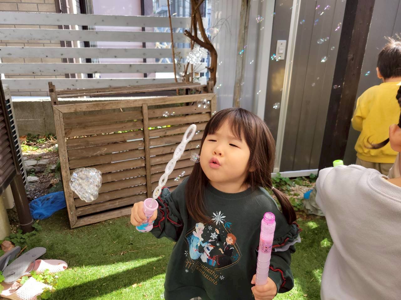 その後は、お庭に出て、みんなでシャボン玉をやったよ!!きれいなシャボン玉がお空にたくさん飛んで行ったね(^^♪