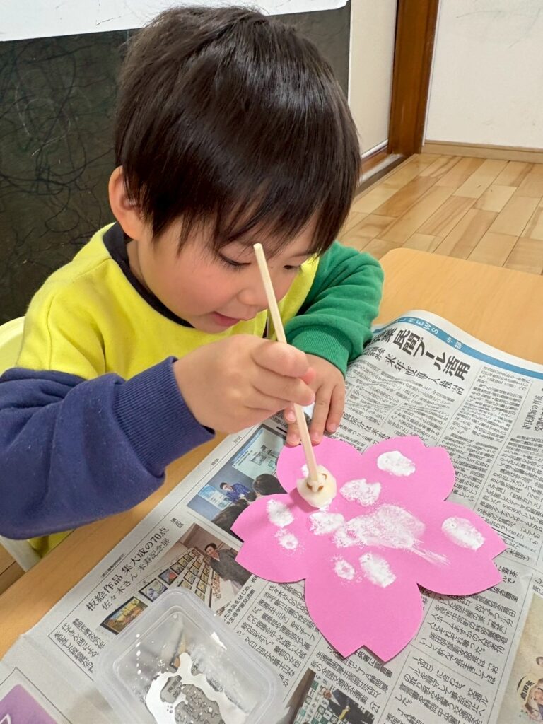 今日は桜の制作をしたよ!スポンジに絵の具を付けて桜の形をした紙にポンポン!上手に出来たかな??その後は防災訓練!!地震が起きたらどうする??カエルポーズで踏ん張るぞ!!先生のお話を聞いて訓練頑張ったね!!散歩もしたよ♪お外の風が気持ちよかったね☻