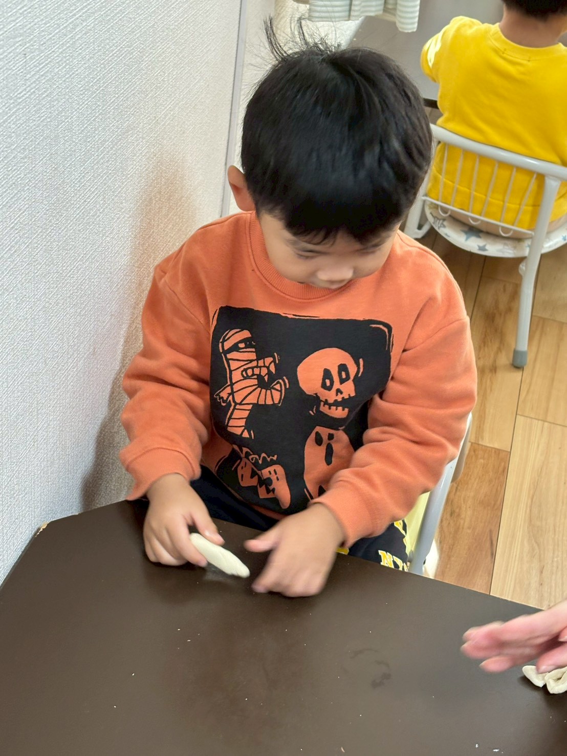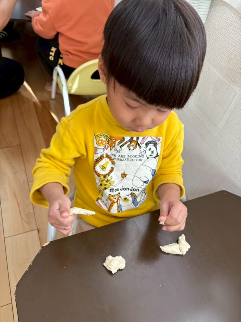 小麦粉粘土で遊んだよ。伸ばしたりちぎったり丸めたりと手先をいっぱい使って遊んだね。アンパンマンやケーキ、餃子の形も先生と一緒に作ってみたけど、少しむずかしかったね。