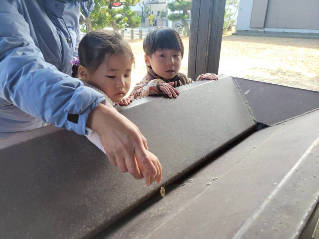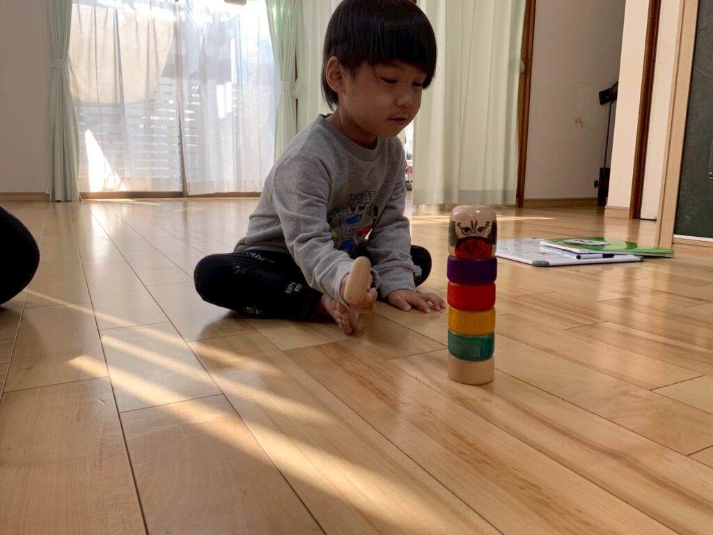 今日はお正月バージョンのサーキットをしたよ!3つのお餅をそーっと積み上げた後は、大きいみかんをタオルに乗せて引いたらゴール‼その後は近所の神社で初詣♬お賽銭を投げて両手を合わせて神様にあいさつしたよ☺
