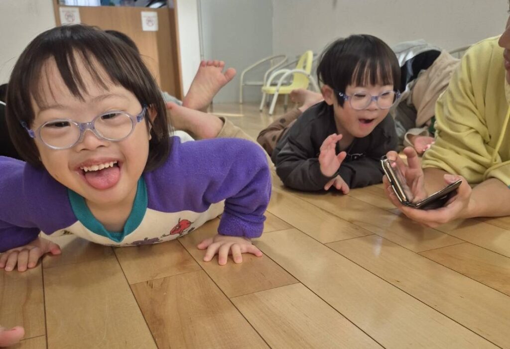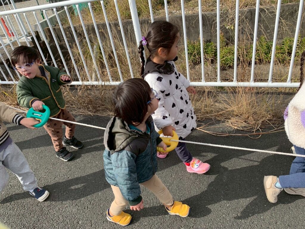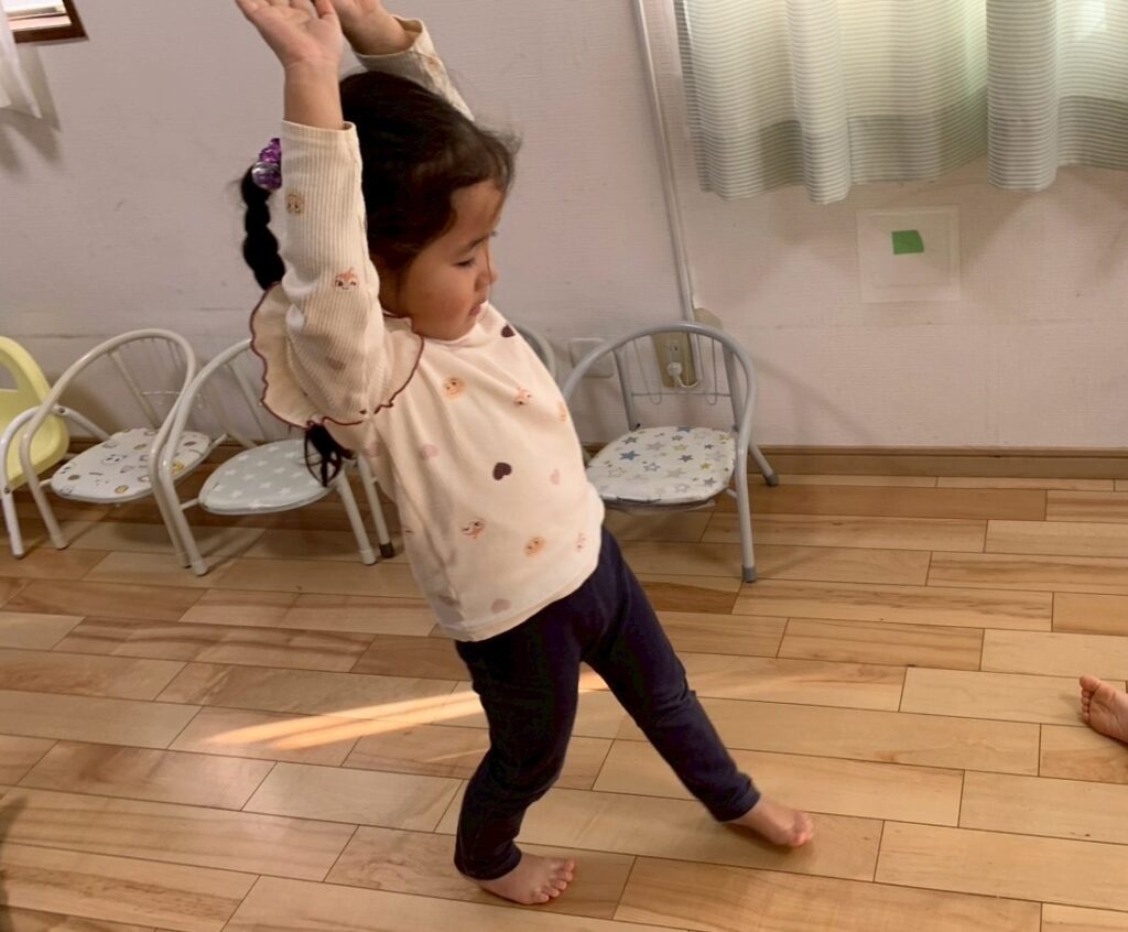 リトミックをやったよ!今日は初めて”きりん”の動きに挑戦!両手を大きく上に伸ばして背伸びして歩くんだけど、ちょっと難しかったね。みんなとっても頑張ったよ!