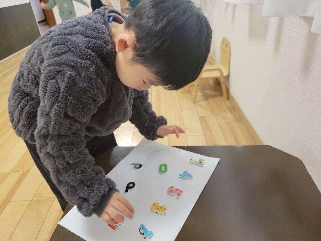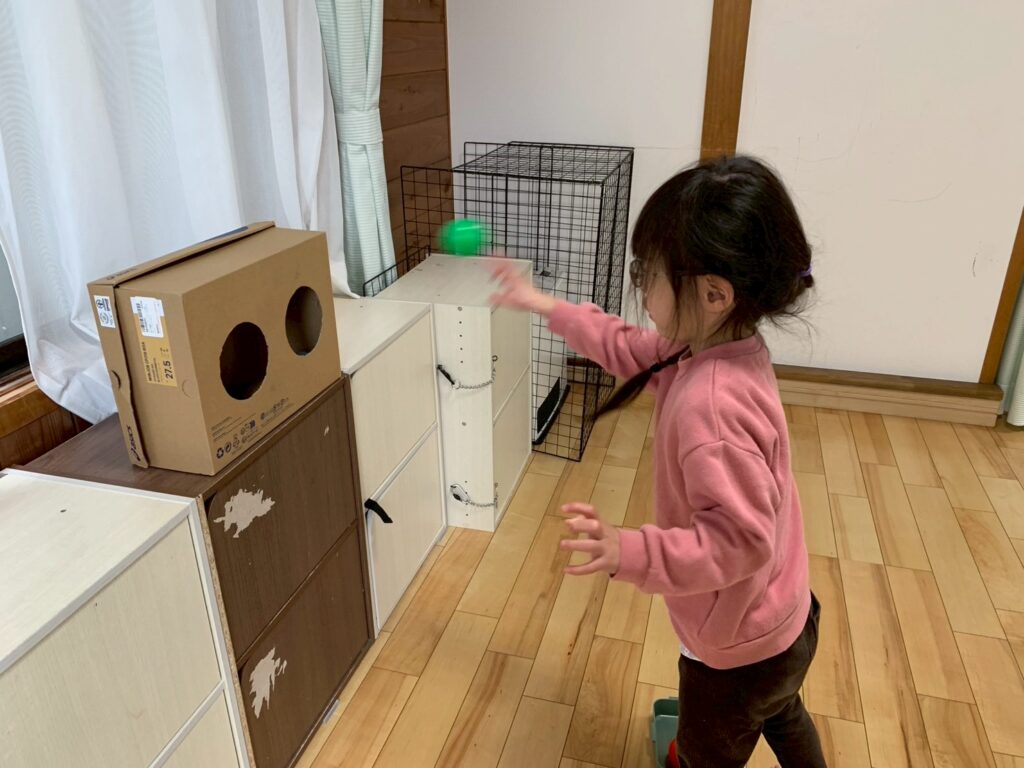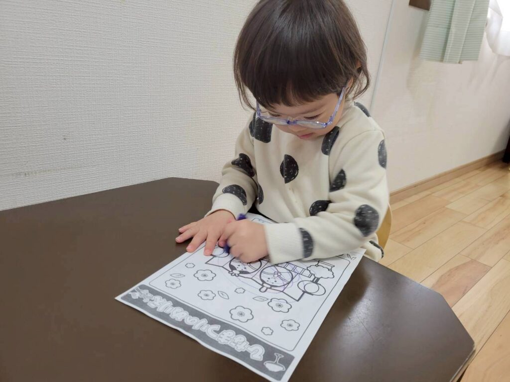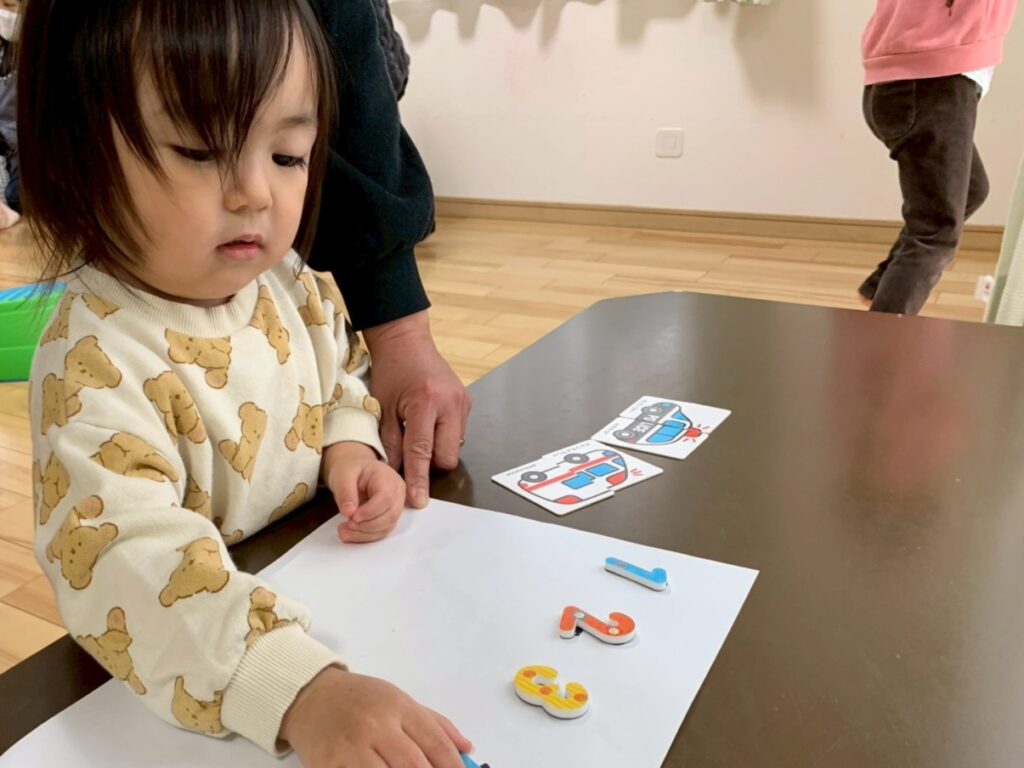 今日のサーキットはけんけんぱっ!!こんなに上手になってきたよ♬2番目は数字のマッチング!1~5の数字をよく見て…一緒なのはどれかな??3番目は穴をめがけてボールをエイッ!!みんなどんどん上達していてビックリ!!その後はおひな様の塗り絵をしたよ☻