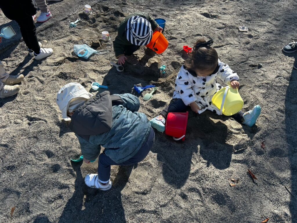 公園へ遊びに行ったよ!みんなお砂遊びに夢中で、スコップですくったお砂をバケツや型はめのおもちゃに入れて楽しんだよ。大きなお山とかも作ってみたいね😊