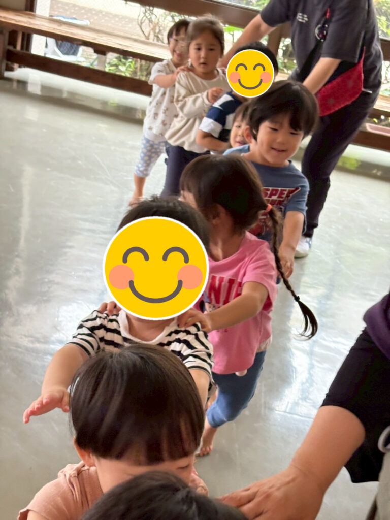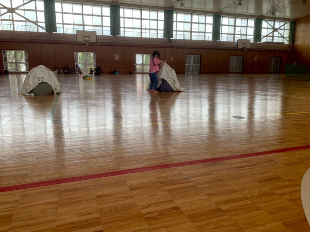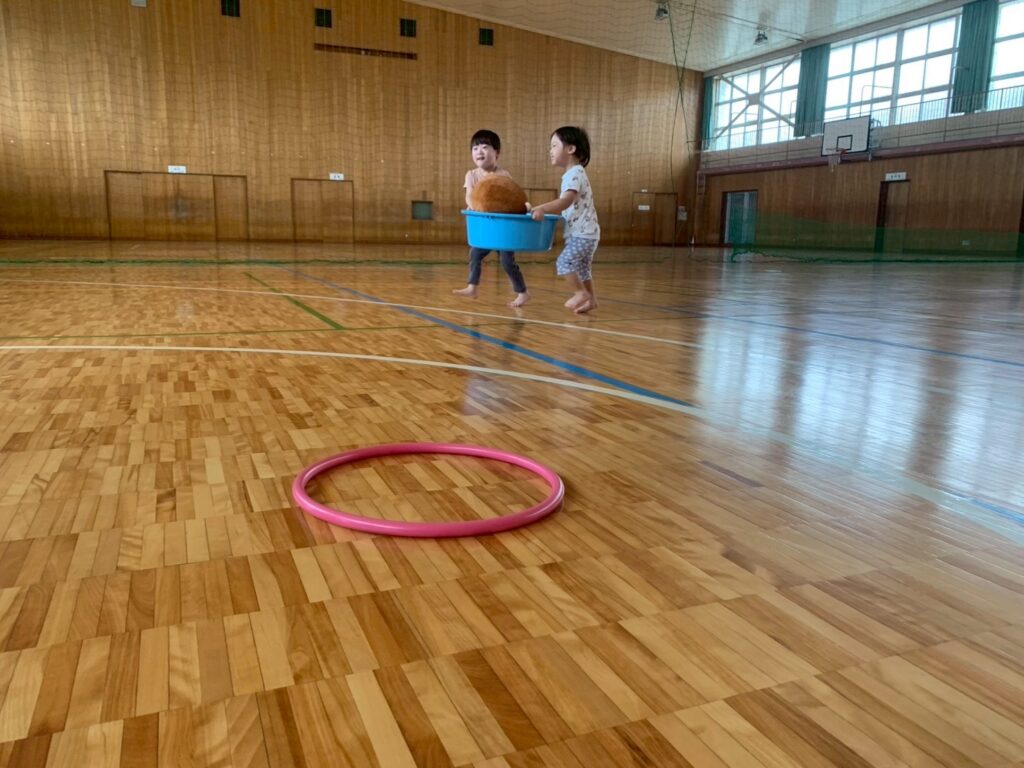 今日は体育館で活動です。タライで人形運びでは友達と協力して上手に運べたよ!