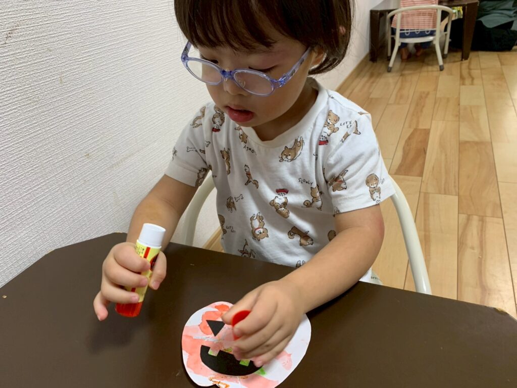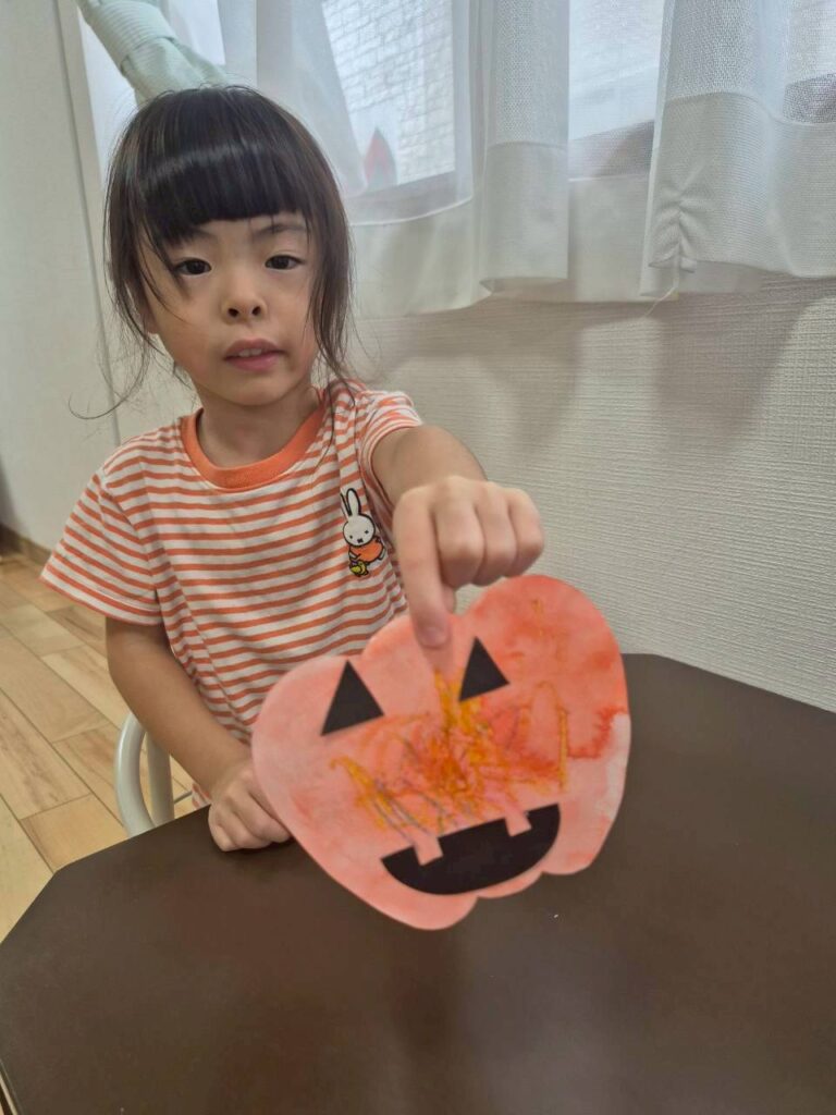 ハロウィンの制作をしたよ!カボチャの形をした紙にのりをつけて目や口を貼って・・・オバケカボチャの完成!!色々なオバケカボチャがあって素敵な作品になったよ!