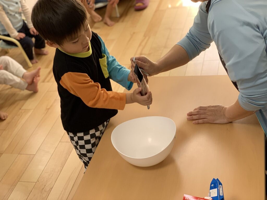 今日はみんなでクッキングをしたよ!大きなボウルに牛乳とフルーチェの素を入れて、グルグルと泡立て器で混ぜ混ぜしたら…おいしそうなフルーチェのできあがり✨まちどおしくてまちどおしくて昼食後のおやつで食べた時はみんないい笑顔だったね♡