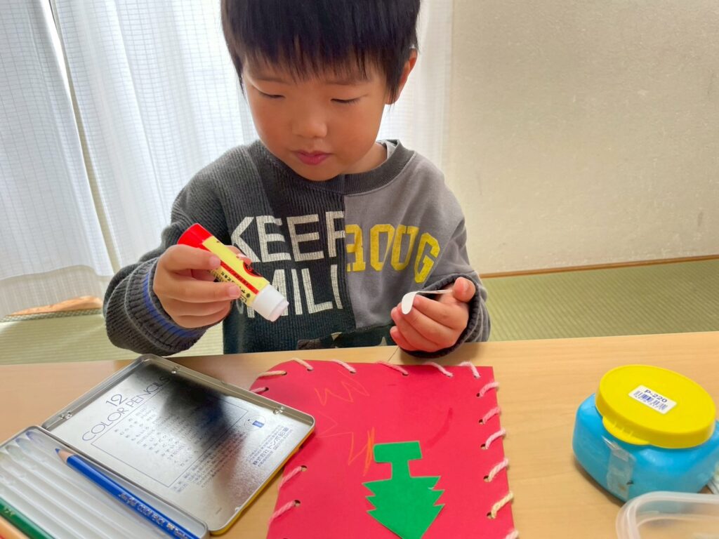 クリスマスの制作をしたよ!!毛糸を穴に通して…少し難しかったけど可愛く出来たよ!!後は飾りを付けて出来上がり!!その後は風船遊び♪落とさずキャッチできたかな??午後はお散歩に行ったよ!どんぐりや赤い葉っぱ、オレンジ色の実を見つけたよ♬