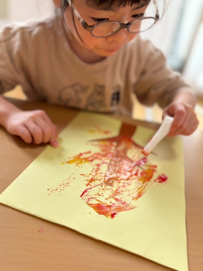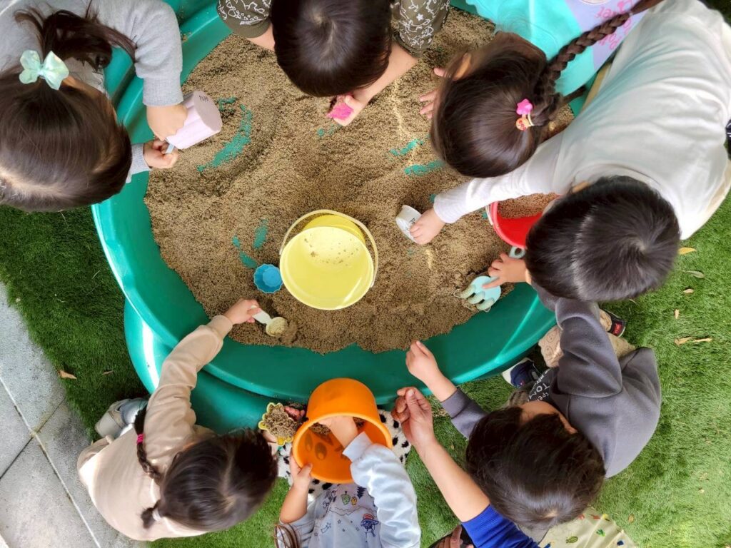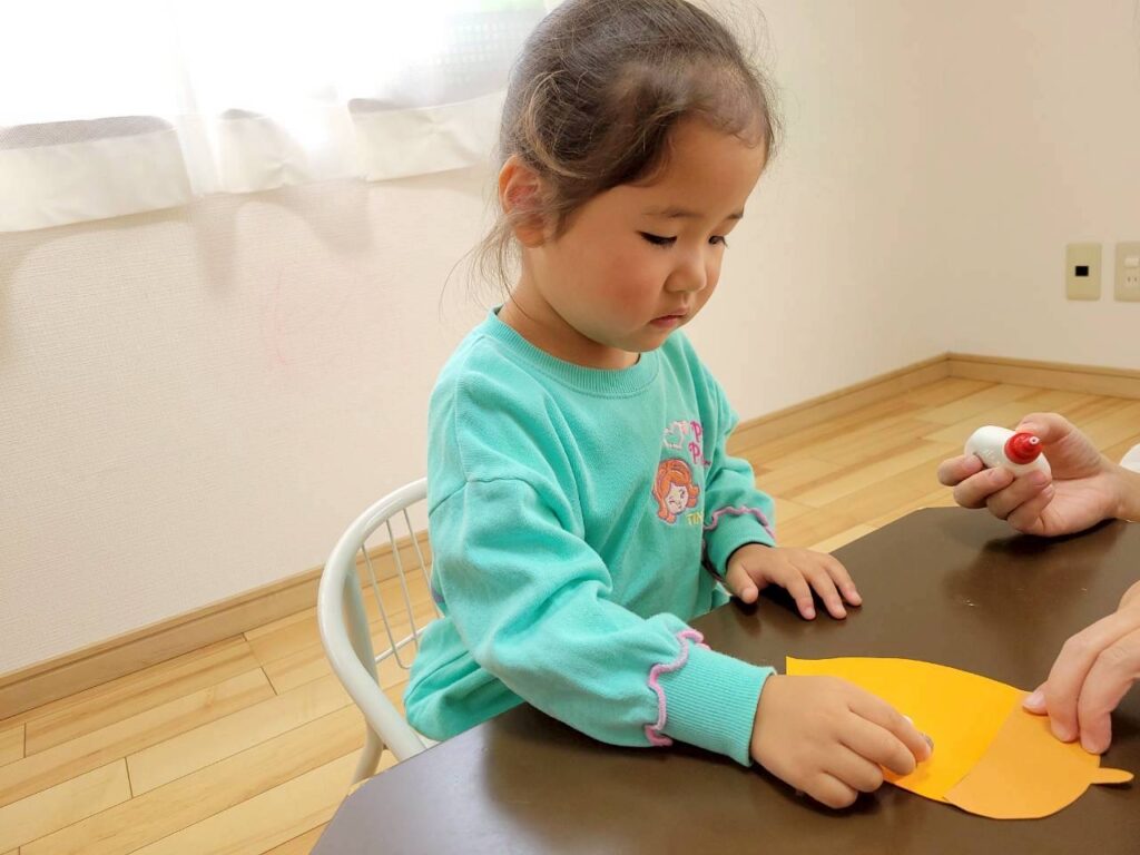 制作をしたよ。画用紙の上にボンドをチョン。その上にドングリをたくさんのせたんだ!もう一つの画用紙には木の周りにスポンジで黄・茶・オレンジの絵の具をポンポンしてステキな紅葉ができたよ♬その後は園庭遊び!今日はPOPOさんのお庭にお砂場が登場!!みんな時間を忘れていっぱい遊んだね。