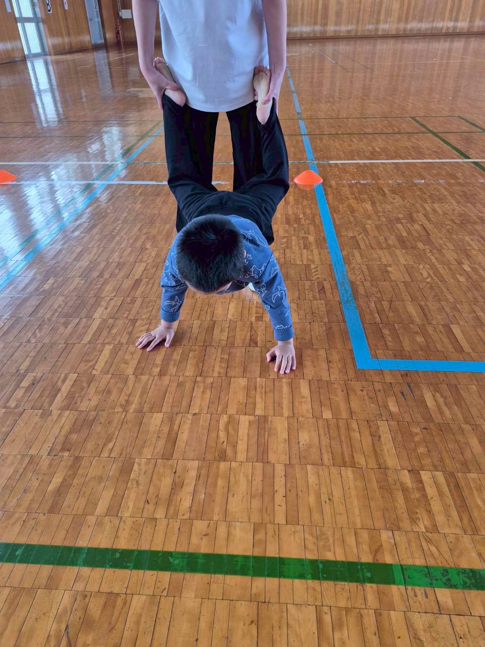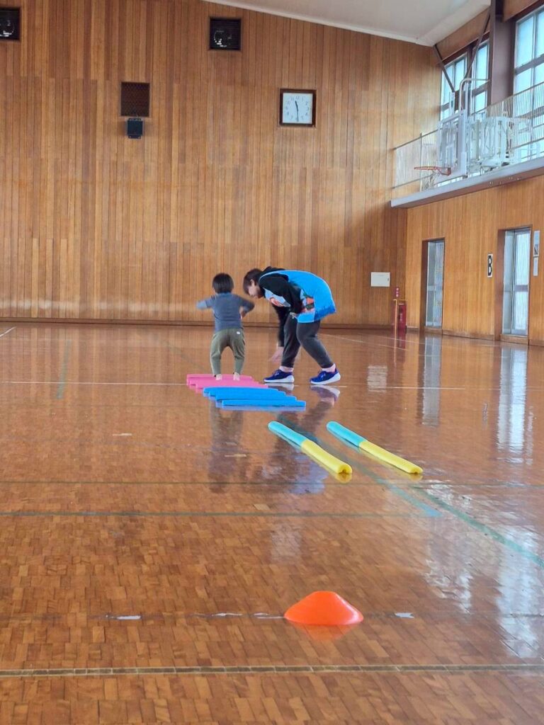 体育館に行ってきたよ。広ーい空間で絵合わせマッチングをしたよ!2枚の絵をマッチングした後はちゃんと色分けけして置くこともできたんだ。腕の力を使って手押し車に挑戦したり、パカポコも練習したら上手に進めるようになったよ♬