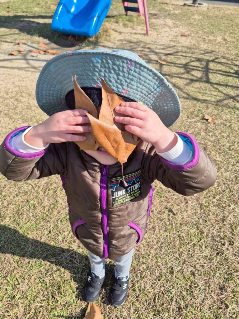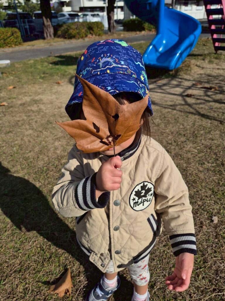 近くの公園では、天気がとてもよくて穏やかな日和の中、大きな枯れ葉で顔を変身させてみたら、みんなにキャーと言って逃げられちゃった!