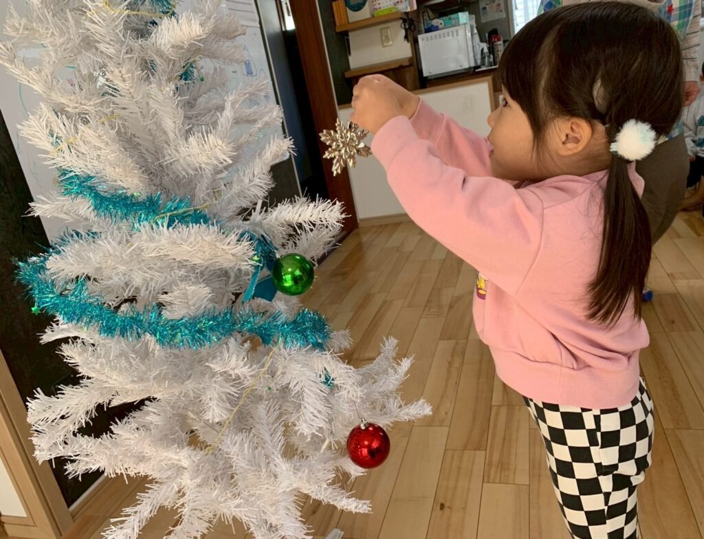 みんなでクリスマスツリーの飾り付け、チクチクしたツリーの枝にひとりずつ順番に飾りをつけていったよ♪出来上がったツリーはキラキラでとってもきれい!!クリスマスが待ち遠しいな♡