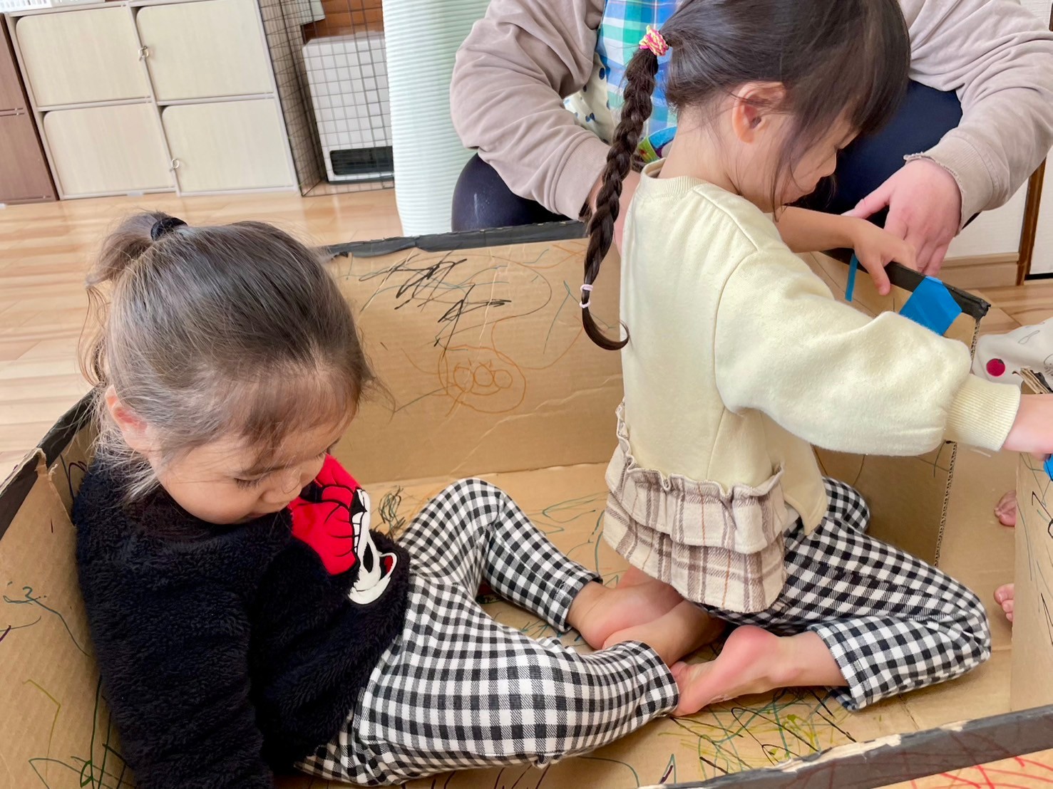 お部屋で段ボール遊びをしたよ!段ボールの中に入ってお風呂みたいにくつろぐ子や、段ボールの中にボールを入れて運ぶ子がいたよ。色んな遊び方があって楽しかったね😊