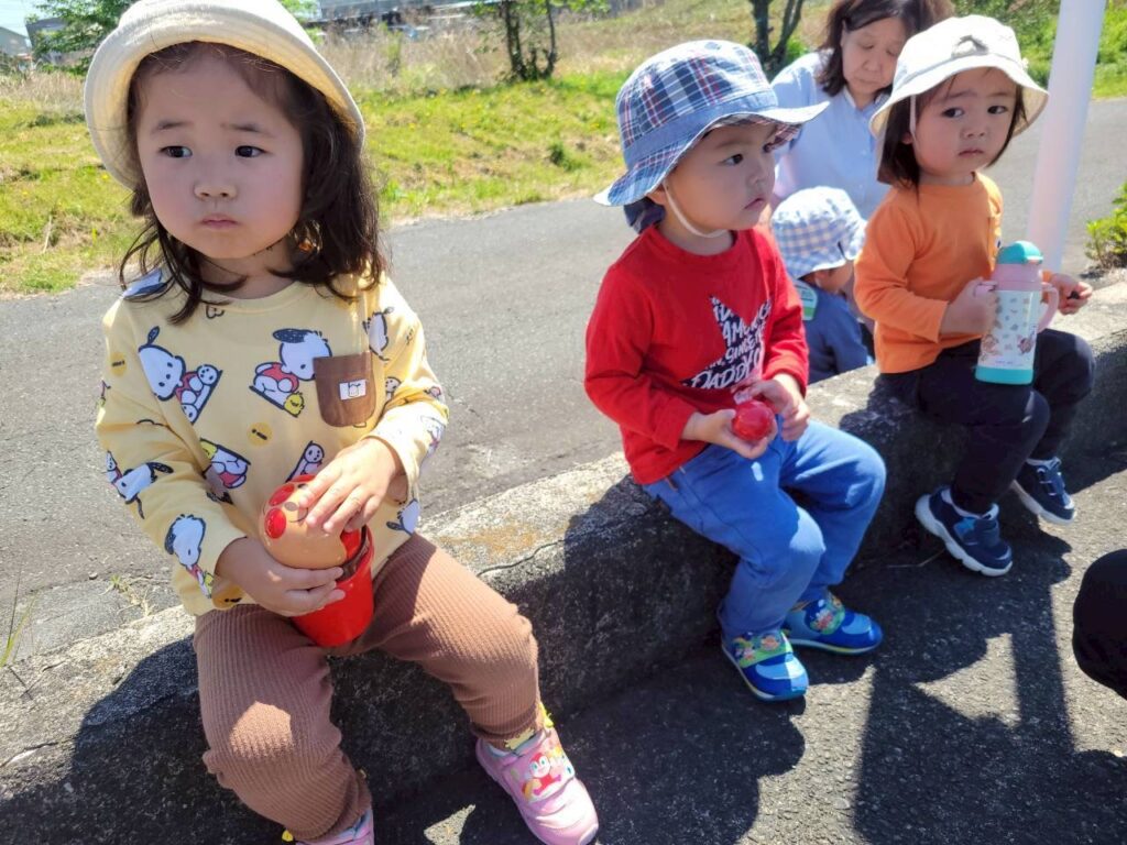 最初は大好きなリトミック!金魚さんになってお尻をゆらゆら~~!その後のドングリは皆で床をコロコロ転がってみたよ。ちょっぴり目が回っちゃった。お散歩ではてんとう虫さんを見つけて大喜び!蝶々さんにも会えて春をいっぱい見つけられたね。