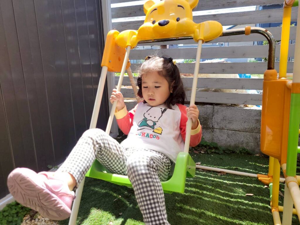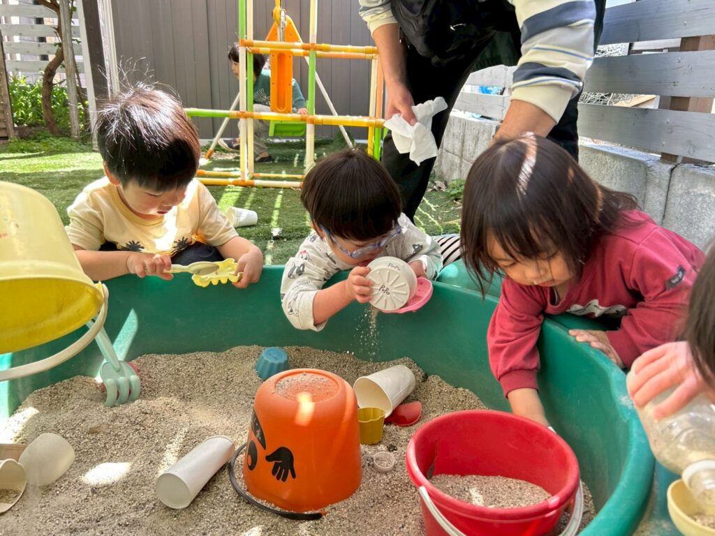 今日は園庭で砂遊びや、ミニブランコやミニジャングルジムをやったよ。
