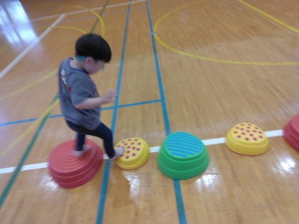 飯田体育館へ行ったよ。4点走では、笛の音を聞いて「よ~いドン!」コースごとにいる先生の姿をよく見ながらゴールまで走ったね☆頑張った後のジュース(ポカリ)は美味しくて、おかわりする子もいたよ😊