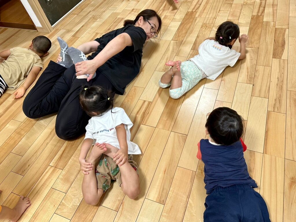 音楽に合わせて身体を動かして楽しかったね!亀さんになったりうさぎさんになったり上手に真似できたね!