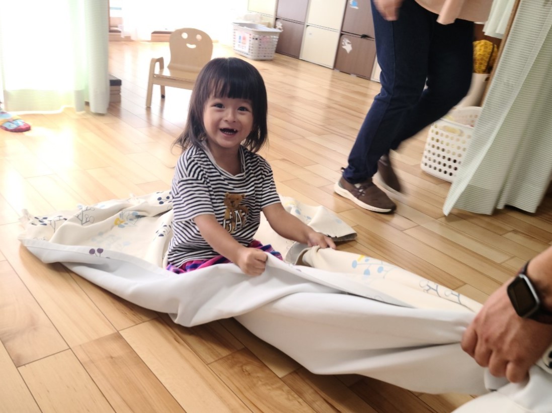 シーツブランコ、ゆらゆら揺れてすごく楽しかったね!テーブルのトンネルくぐりもみんな上手にできたね。