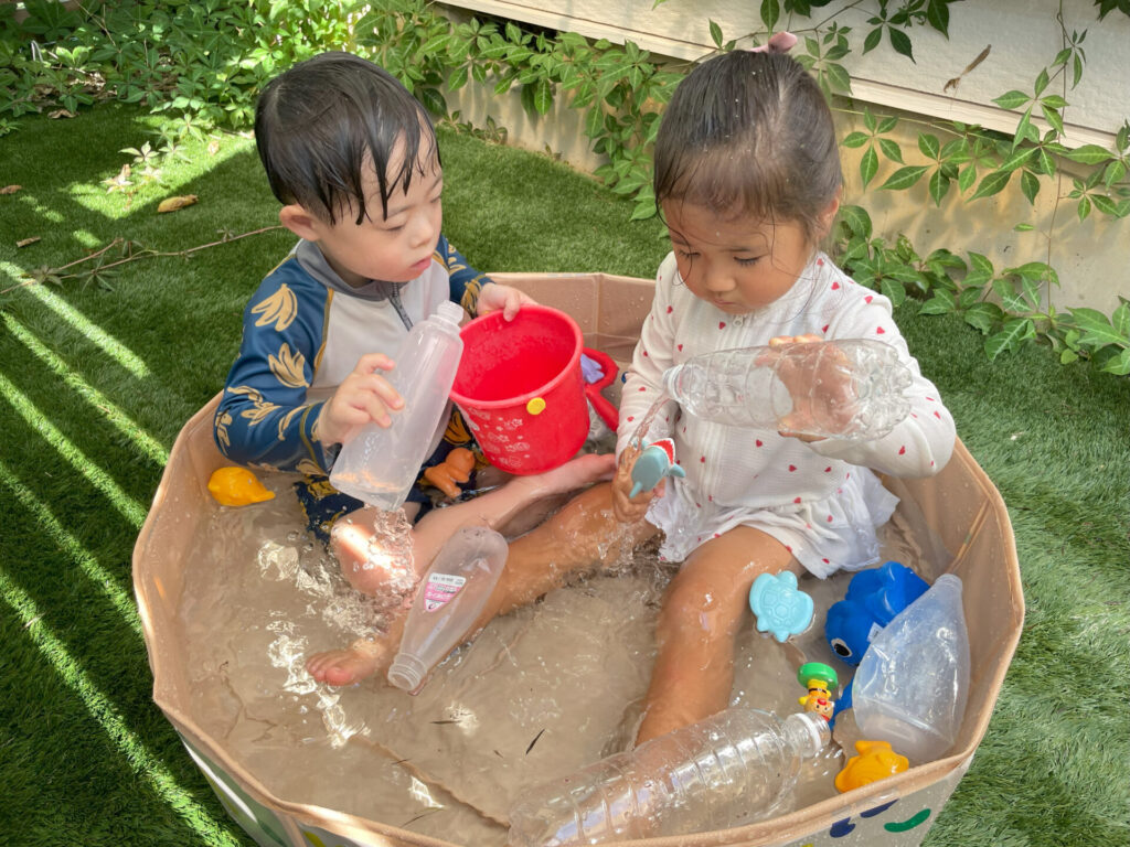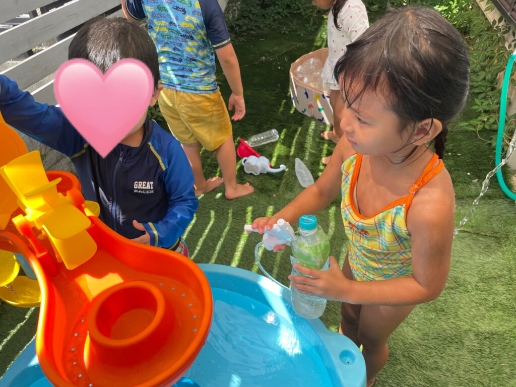 まだまだ暑い日が続く中、POPOさんでは水遊びで盛り上がっています♪ウォーターテーブルの水の中に両手を入れたり、ビニールプールに入って涼んだり…冷たくて気持ちよかったね☆