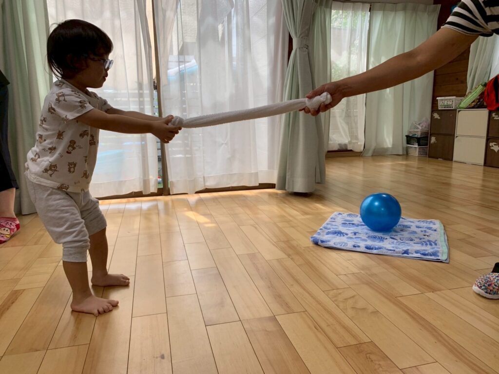 先生に勝てたかな・・・?その後は大きなタオルの上にボールを乗せて落とさないようにゴール!!とっても頑張ったね😊