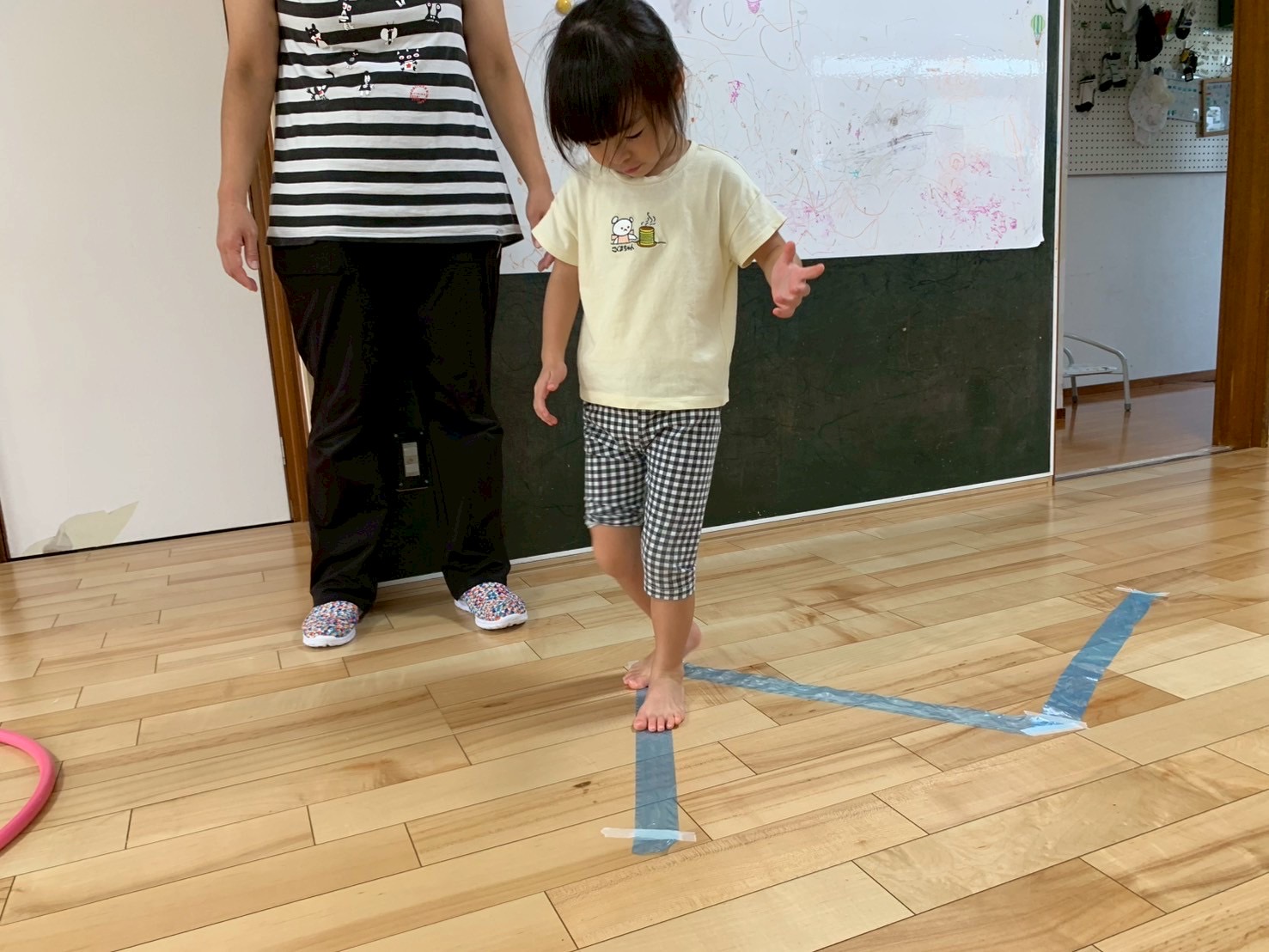 サーキットをしたよ!ジグザグに貼ったテープの上を歩いて、フラフープを先生とタオルでひっぱりっこ♬