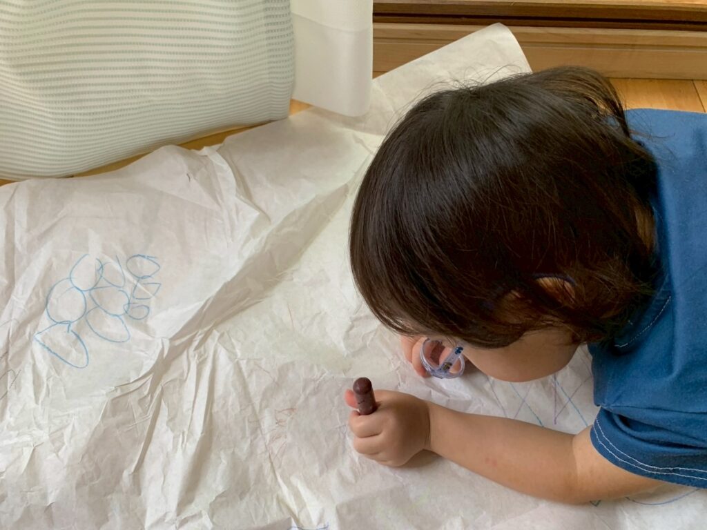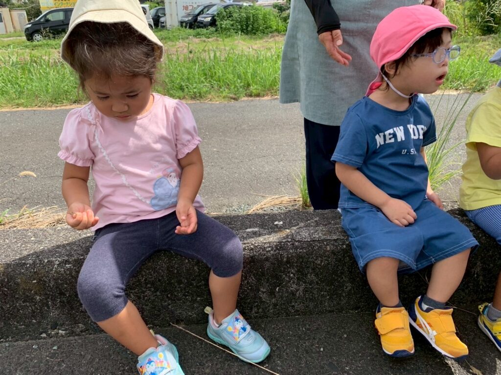 今日は久しぶりに散歩に行ってきたよ!トンネルの中で「やっほ~!!」と声が響いて楽しかったね!大型お絵描きでは腕を大きく動かしていっぱいグルグルって描けたよ!!