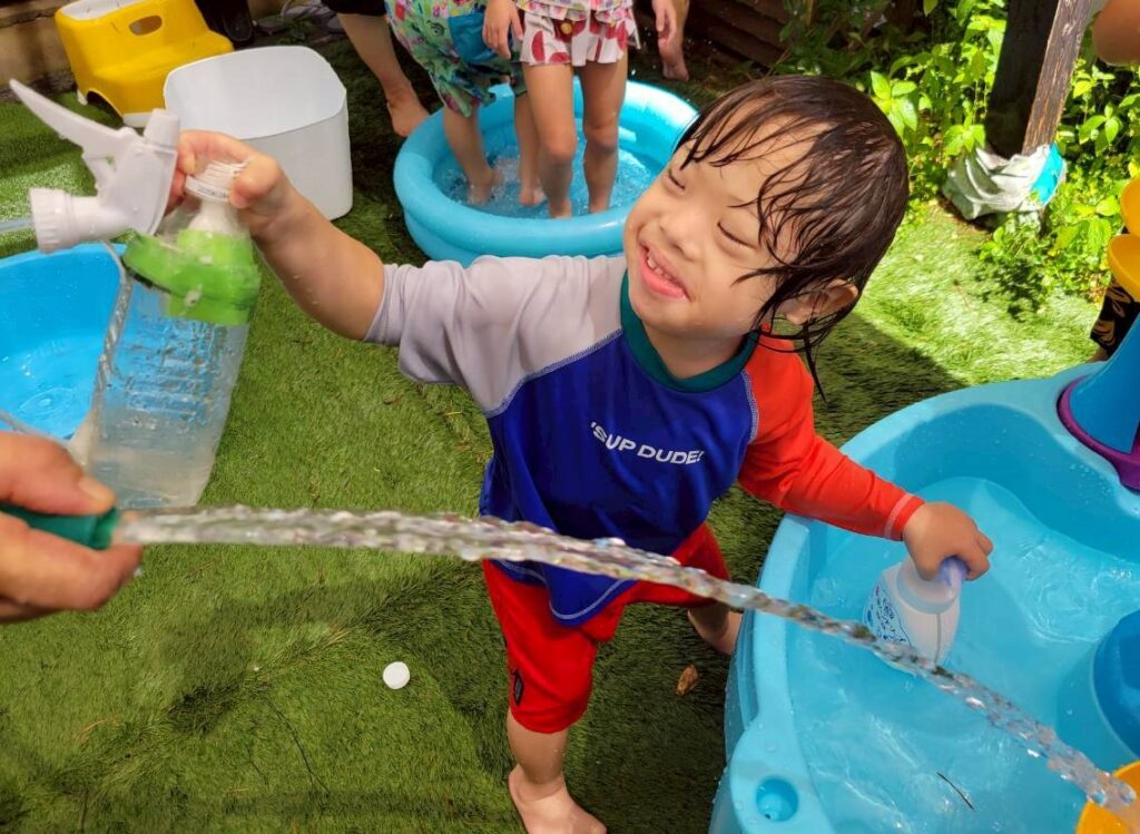 水遊びでは泡遊び、氷遊びを楽しんだよ♪カップから氷を出したら、先生やお友達の手や足にピトッ!ひんやり冷たくて気持ちよかったね😊