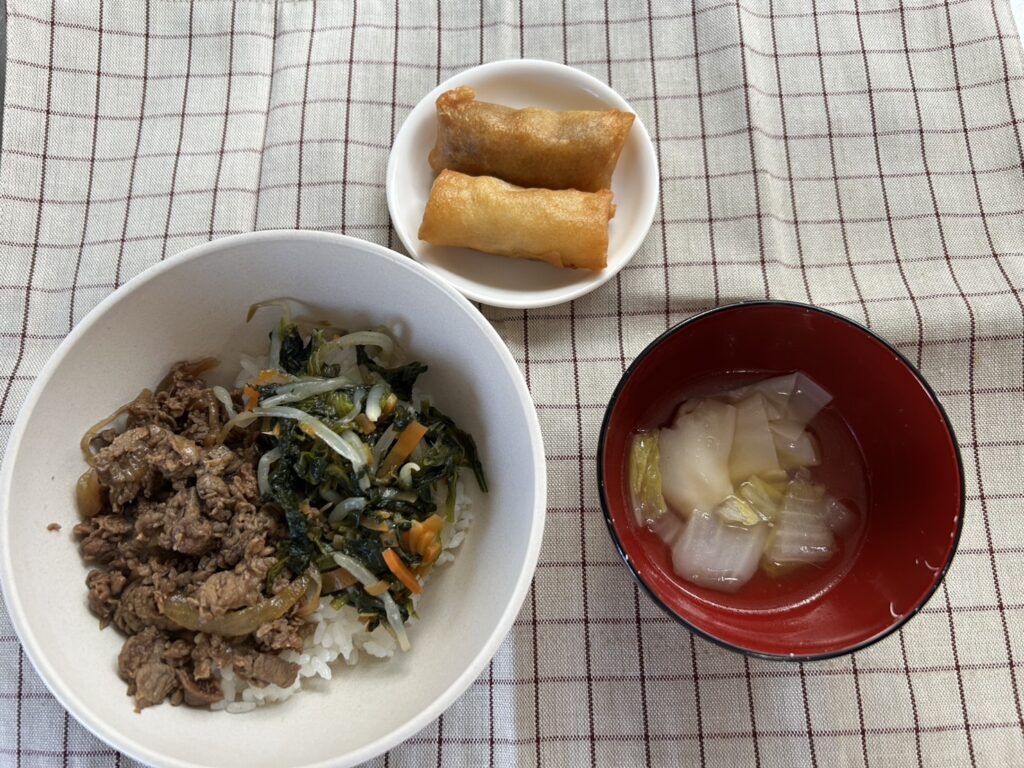 三色ナムルのビビンバ丼、白菜とワンタンの中華スープ、春巻き/せんべい
