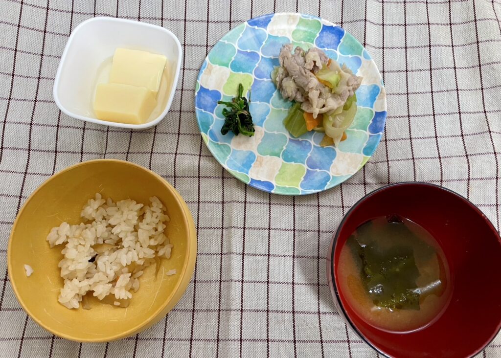 筍ご飯、大根とワカメの味噌汁、春キャベツの野菜炒め、卵豆腐or冷奴、ほうれん草のおひたし/ せんべい・セレクト菓子