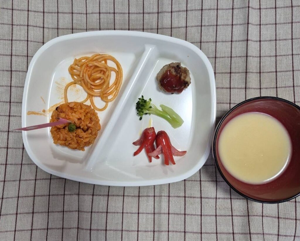 おこさまランチ(チキンライス、手作りハンバーグ、たこさんウィンナー、ナポリタンスパゲッティ、ブロッコリー、コーンクリームスープ/セレクトお菓子・ばかうけorハッピーターン