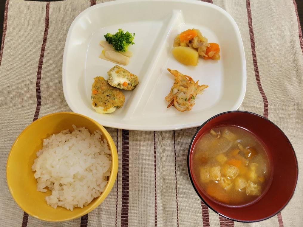 ご飯、なめこの味噌汁、豆腐ハンバーグ、肉じゃが、カニカマの磯辺揚げ、サラダチキンとブロッコリーの胡麻ドレ和え/サッポロポテトorハッピーターン・スティックゼリー