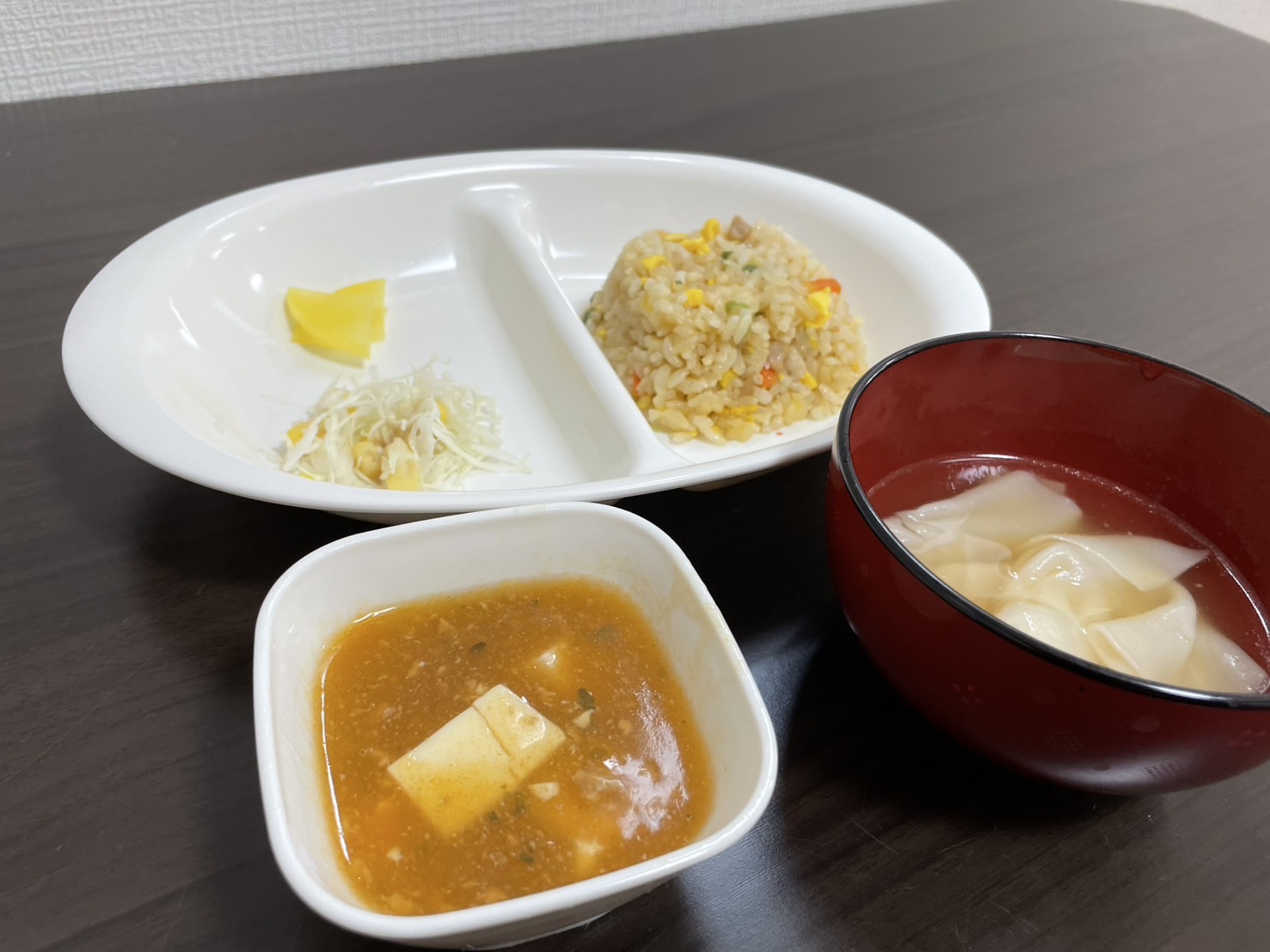 チャーハン・麻婆豆腐・千切りキャベツとコーンサラダ・たくあん・ワンタンスープ/セレクトお菓子・ハッピーターン