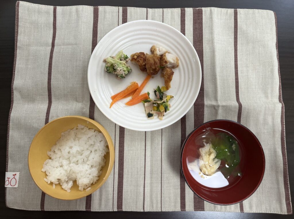 唐揚げ、ブロッコリーとツナのサラダ、人参グラッセ、ほうれん草とコーン、ベーコンのバター醤油炒め、レタスと卵のスープ、ご飯