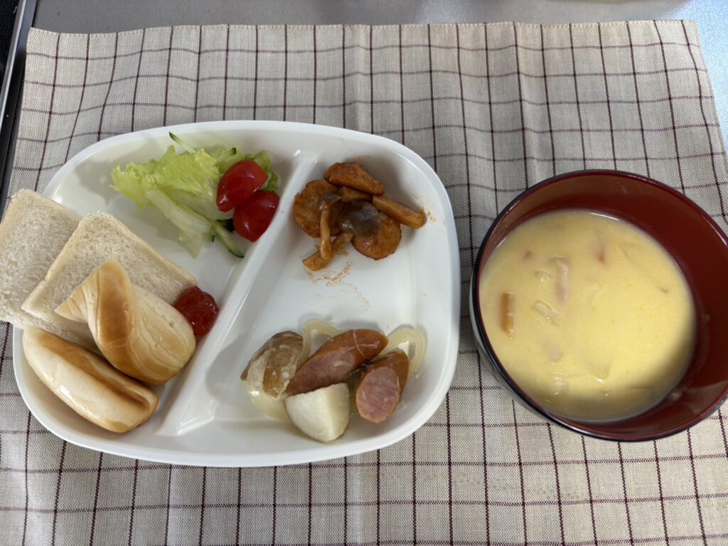 食パン・バタースティック・コーンクリームシチュー・ジャーマンポテト・きのこと肉団子のケチャップ炒め・サラダ/かっぱえびせんorホームパイ・スティックゼリー