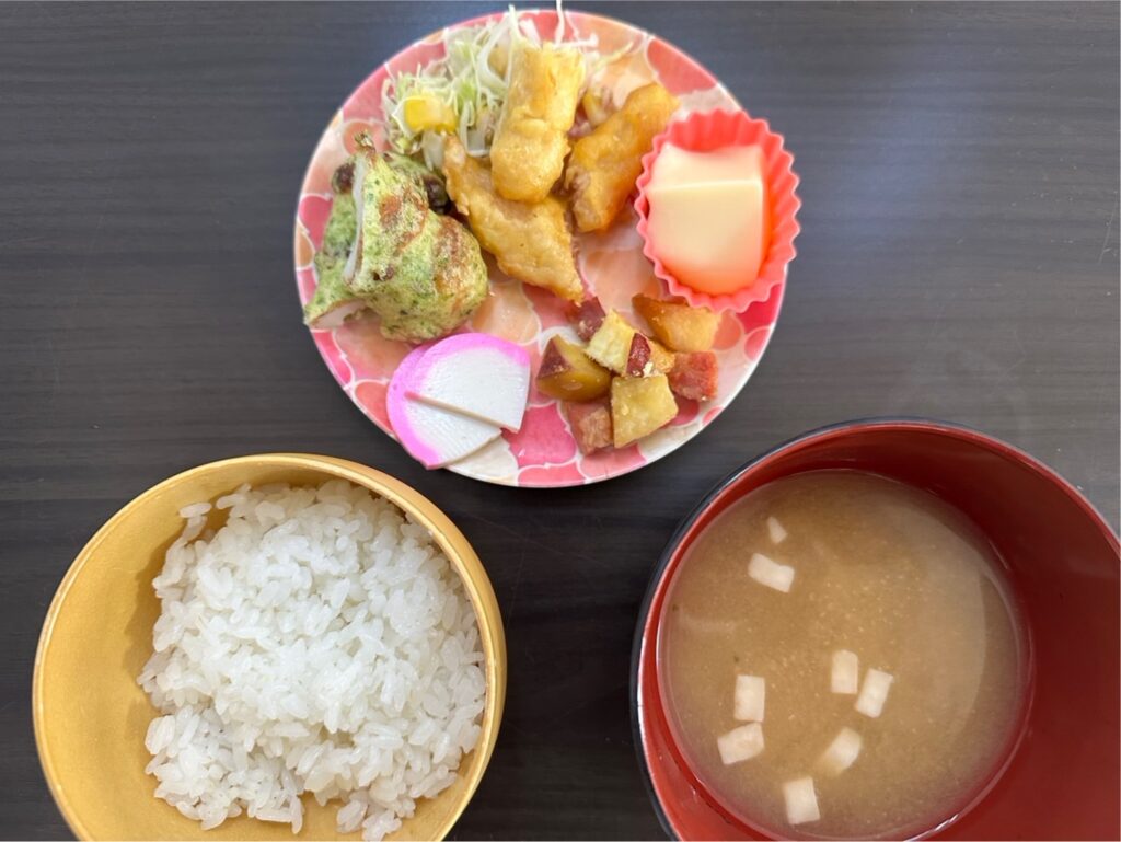 とり天・磯辺揚げ・さつまいもとベーコンの甘酢炒め・ツナコーンサラダ・かまぼこ・たまご豆腐・ご飯・味噌汁/セレクトお菓子・ミルククッキー