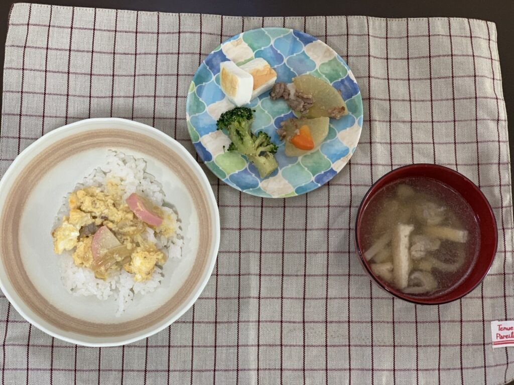 たまご丼・大根と人参のそぼろ煮・はんぺんチーズ・ブロッコリーの胡麻和え・うどんのすまし汁/おにぎりせんべい・セレクトお菓子