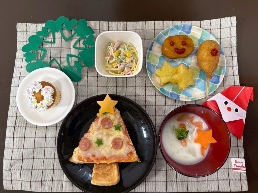 ツリー型ピザトースト・アメリカンドッグ・星形ポテト・チキンナゲット・スパサラ・クリームシチュー/たべっこどうぶつ・カップケーキ