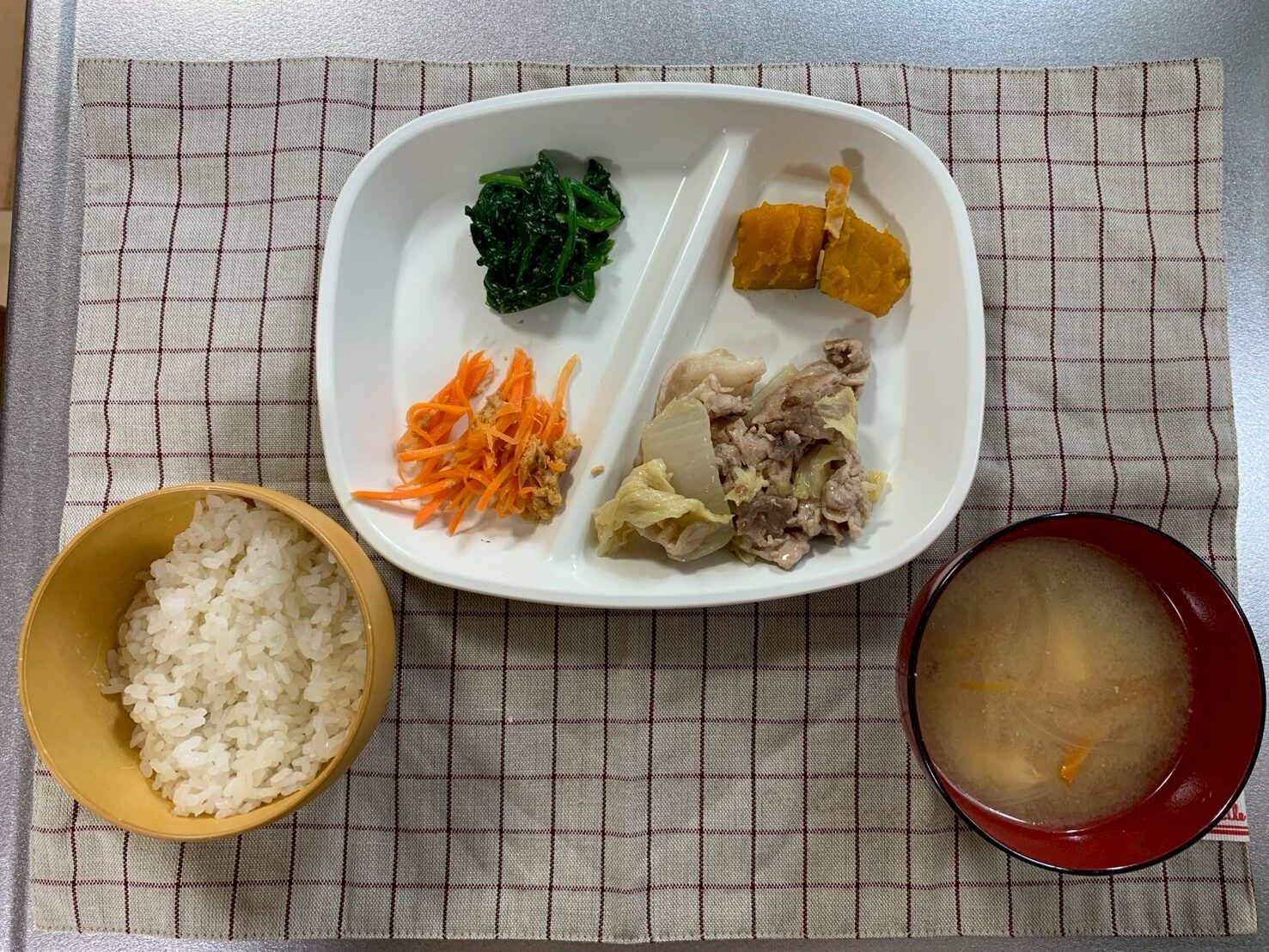 ご飯・白菜と豚肉のうま煮・人参しりしり・ほうれん草のごま和え・カボチャの煮物・大根の味噌汁/おっとっと・スティックゼリー
