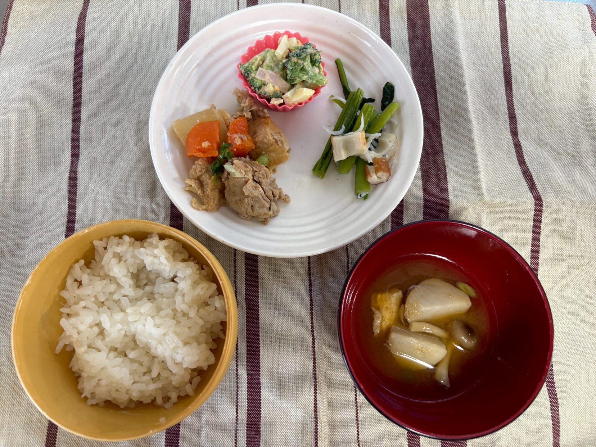 ご飯・里芋の味噌汁・豚肉と根菜の照り煮・ちくわと小松菜のしらす和え・ブロッコリーと卵のサラダ