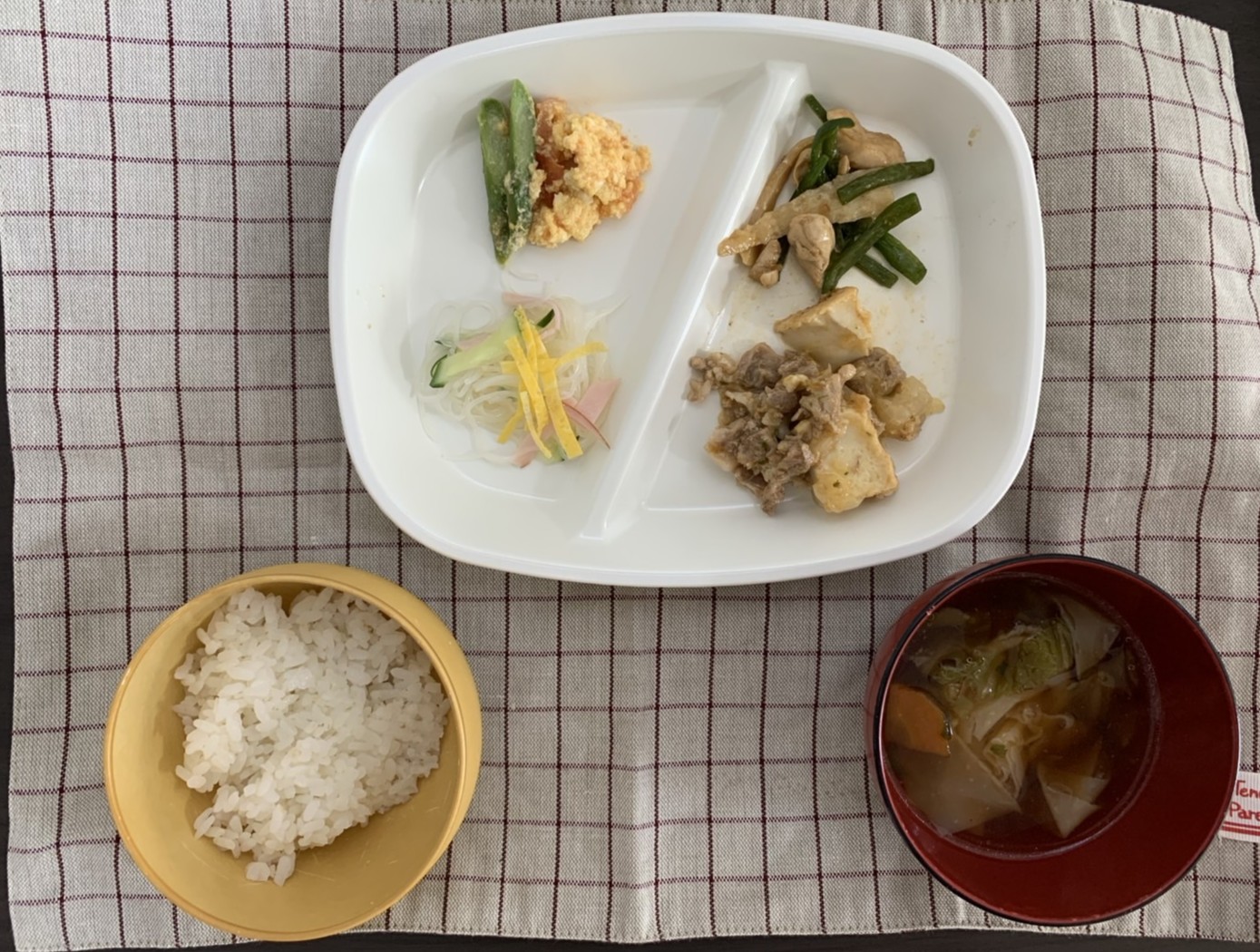 ご飯・具だくさんのワンタンスープ・厚揚げと大根の麻婆・鶏ささみの青椒肉絲風・4種の春雨サラダ・トマトとアスパラの卵とじ/ポテコor動物ビスケット・ハッピーターン