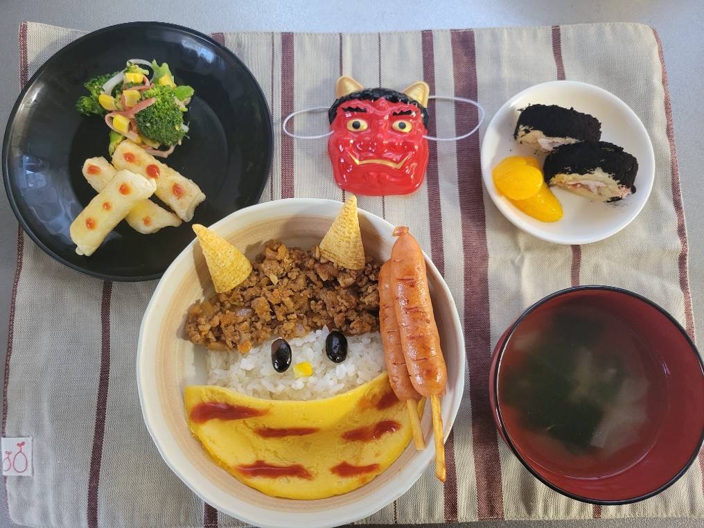 鬼タコライス・ブロッコリーのサラダ・チーズ揚げ・わかめスープ/白い風船・恵方巻ロール