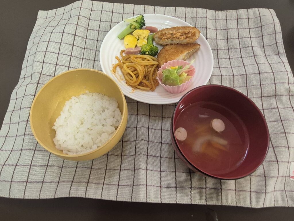 グラタンコロッケ、サーモンメンチカツ、シーザーサラダ、ミートソースパスタ、卵・ブロッコリー・ハム炒め、コンソメスープ、ごはん/スティックゼリー