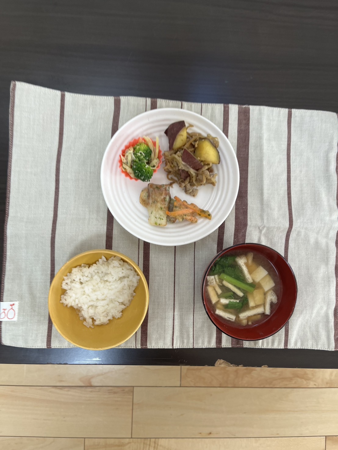 ご飯、豆腐と小松菜の味噌汁、豚肉とさつまいもの甘辛煮、竹輪と人参の磯辺揚げ、ブロッコリーとツナと人参の和風サラダ