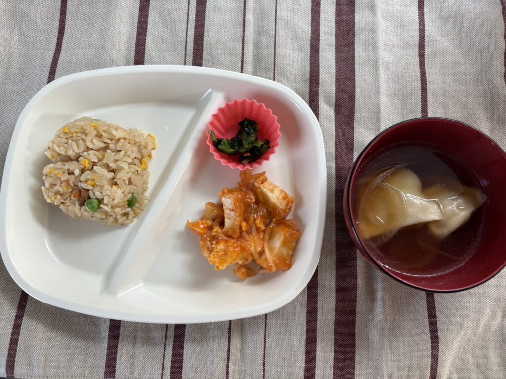 チャーハン、水餃子、ふんわり卵と厚揚げともやしのチリソース風炒め、ほうれん草とにんじんのナムル/せんべい