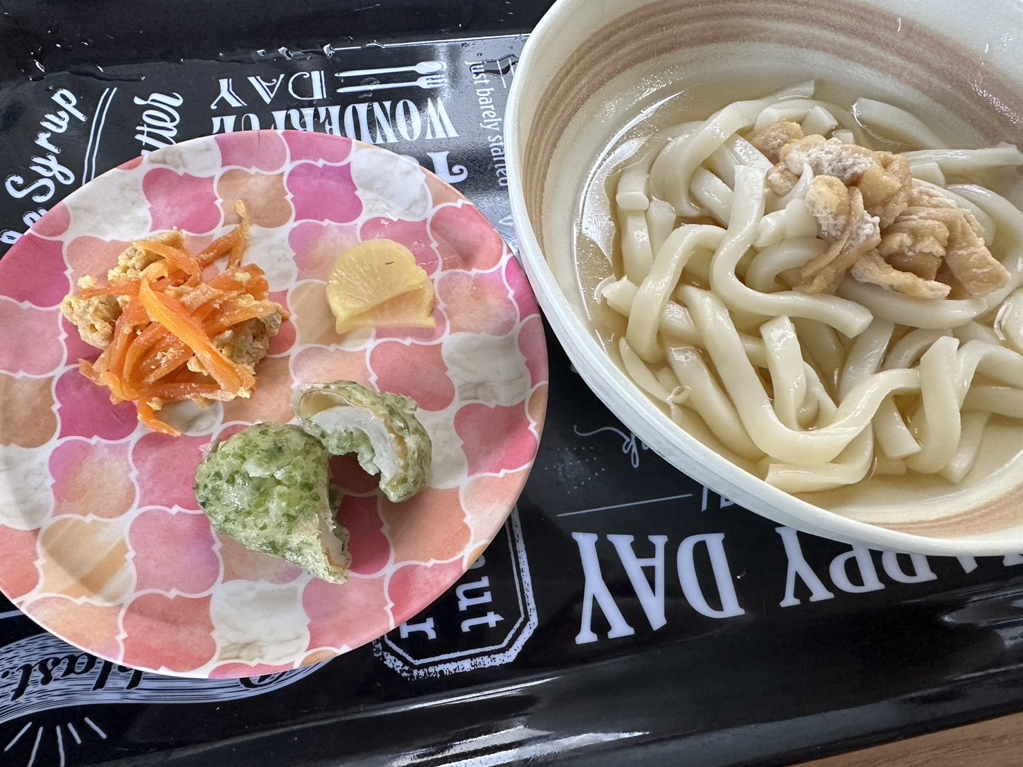 きつねうどん、にんじんしりしり、ちくわの磯辺揚げ、たくあん/雪の宿・スティックゼリー