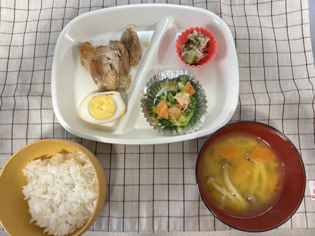 ご飯・鶏肉の照り煮・ブロッコリーと人参のみそマヨネーズ・煮卵・キュウリとツナの甘酢和え・かぼちゃのみそ汁
