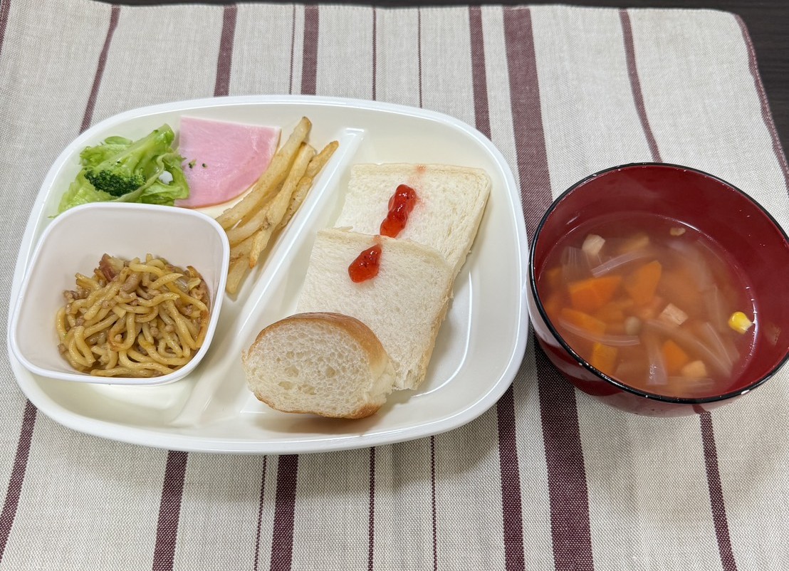 選べるパン(食パン・ロールパン)・焼きそば・ハム、チーズ・ポテト・ミネストローネ・サラダ/うす焼きせんべい・バームクーヘン