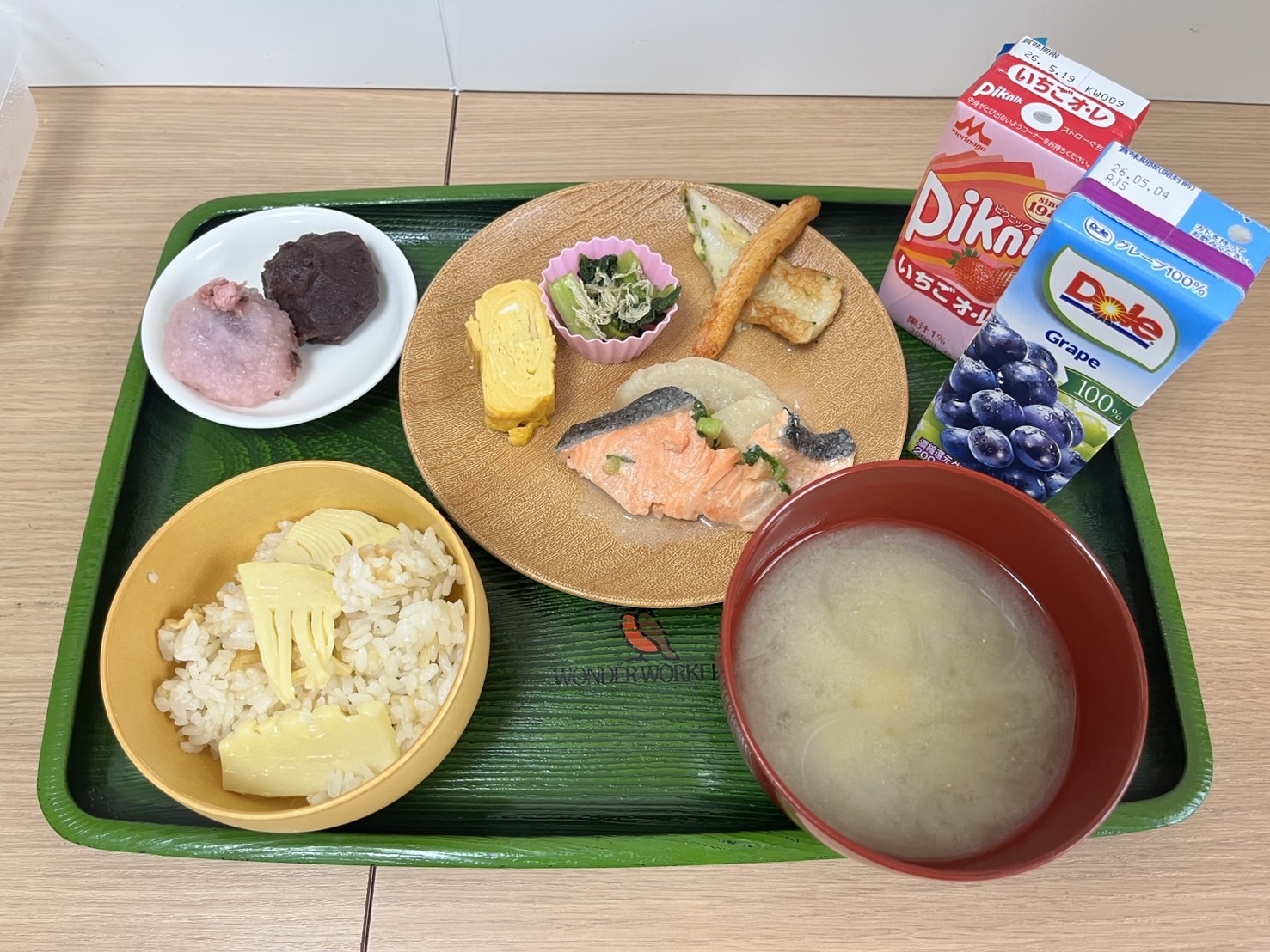 たけのこの炊き込みご飯、さつまいもと新玉ねぎのみそ汁、さけ大根、卵焼き、たくわのてんぷら、小松菜のとろろ昆布和え/セレクトおやつ・おはぎ