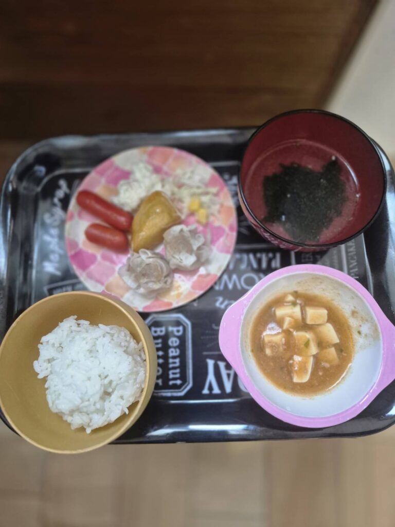 麻婆豆腐・シューマイ・赤ウインナー・中華ポテト・ポテトサラダ・わかめスープ・ご飯/ぱりんこ・スティックゼリー